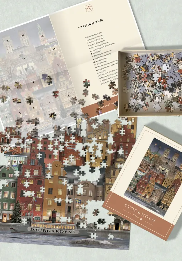 Mälarens drottning och nordens Venedig, Sveriges huvudstad Stockholm, i tolkning av stadsvyernas mästare Martin Schwartz. Med noggrannhet och känsla har han försökt fånga vår huvudstads själ och delar av dess arkitektur under en stjärnklar natthimmel. Känner du igen byggnaderna?