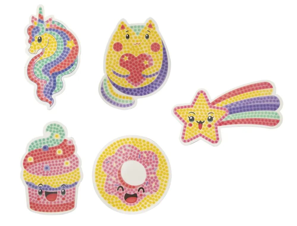 Ett pysselkit som innehåller allt du behöver för att skapa magneter i form av en enhörning, cupcake, munk, katt och ett stjärnfall.
