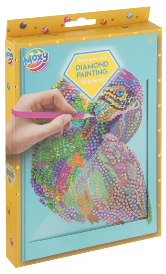 Innehåller: en anteckningsbok med mall för papegojmönster på bokens hårda pärm, 6 påsar med kristaller, 1 vaxkaka, 1 appliceringspenna, 1 kristallbricka samt instruktioner.