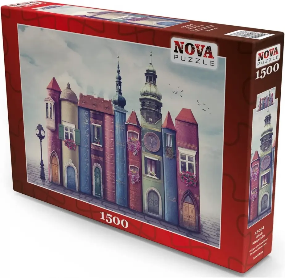 Fem magiska hus i form av bokryggar i olika färger står tätt ihop. I fönstren dignar vackra blommor och varje port har unika dörrar i trä. Husen står på en stenbelagd gata och i bakgrunden syns tät dimma med moln och en flock svävande fåglar. Motivet är illustrerat av konstnären Elena Schweitzer.