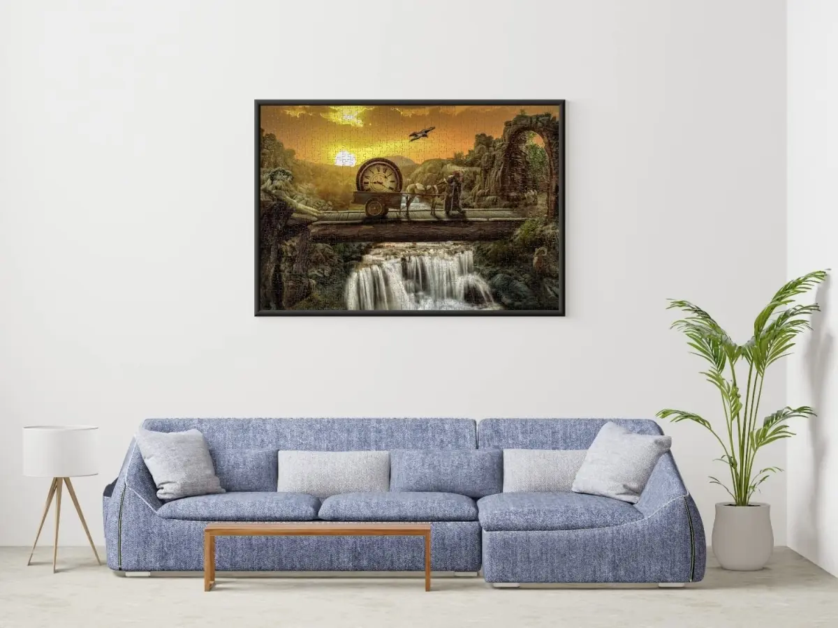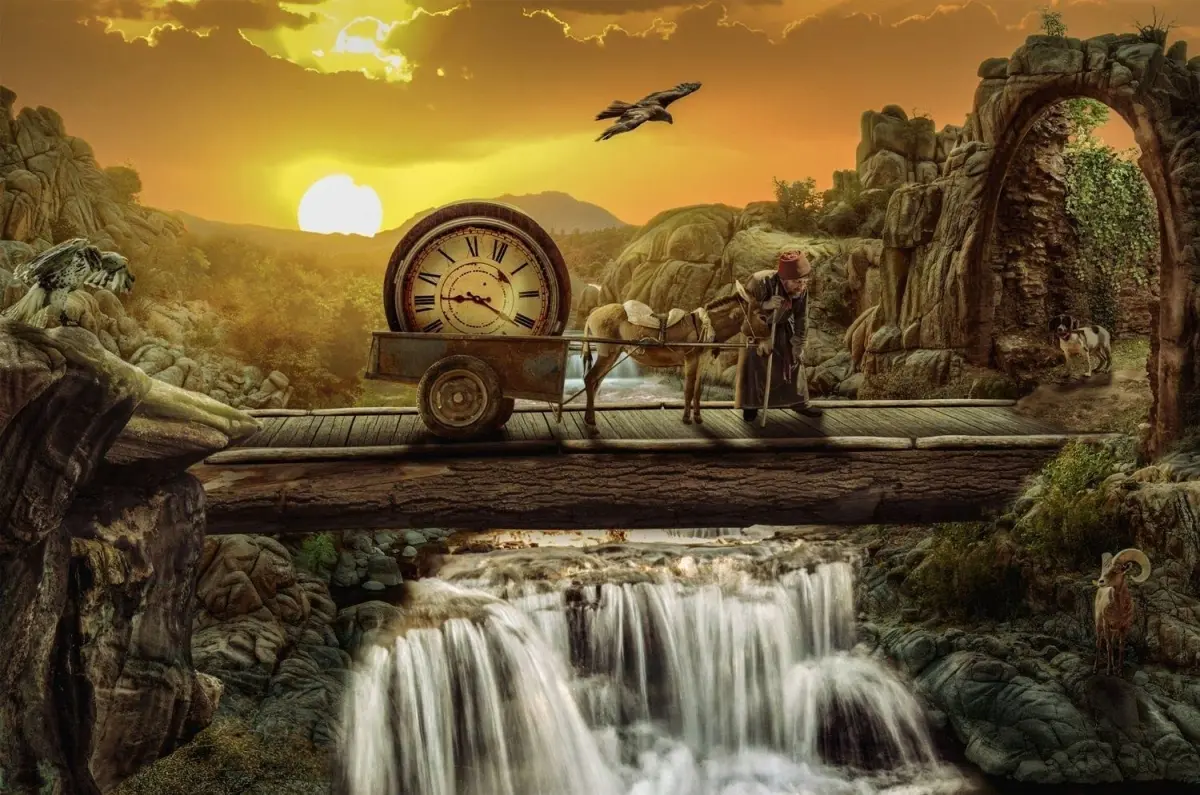 Mannen har en Åsna och en hund som följeslagare och åsnan drar en kärra där det ligger ett stort gammalt ur. Under bron dånar ett vattenfall och över deras huvuden svävar en fågel mot en strålande solnedgång.