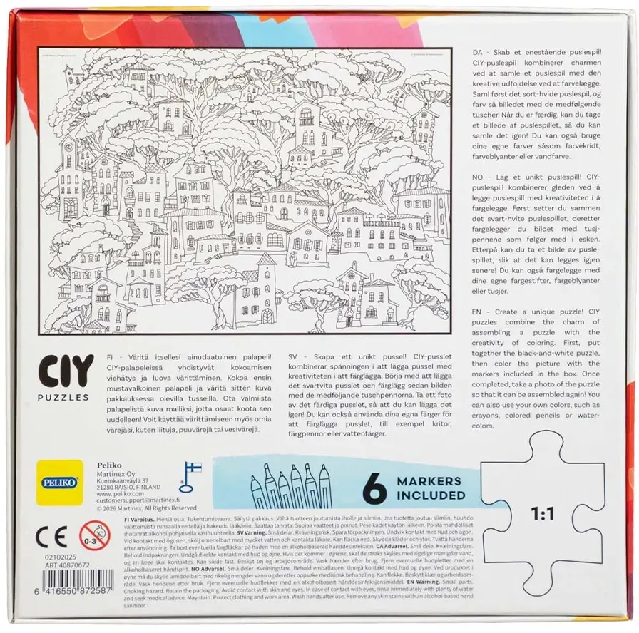 Det här pusslet kombinerar spänningen i att lägga pussel, med kreativiteten i att färglägga och måla. Börja med att lägga det svartvita pusslet med 99 bitar, och färglägg sedan bilden med de medföljande tuschpennorna.
