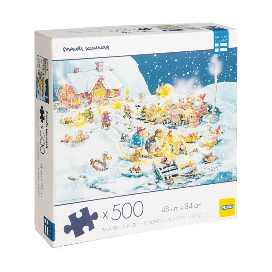 Ett 500-bitarspussel med ett detaljrikt, roligt och juligt motiv av den finska serietecknaren och barnboksförfattaren Mauri Kunnas.