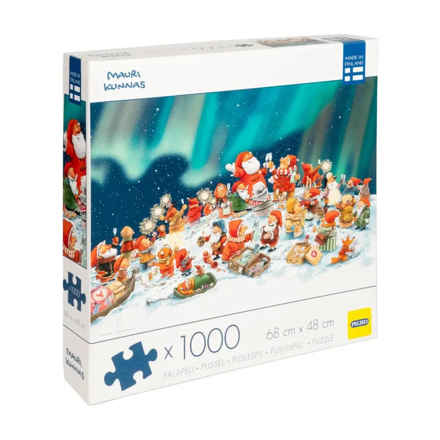 Ett tusen bitars pussel med jultema. Mauri Kunnas stämningsfulla illustration av julafton på den snöiga kullen, under norrskenet, är full av detaljer.
