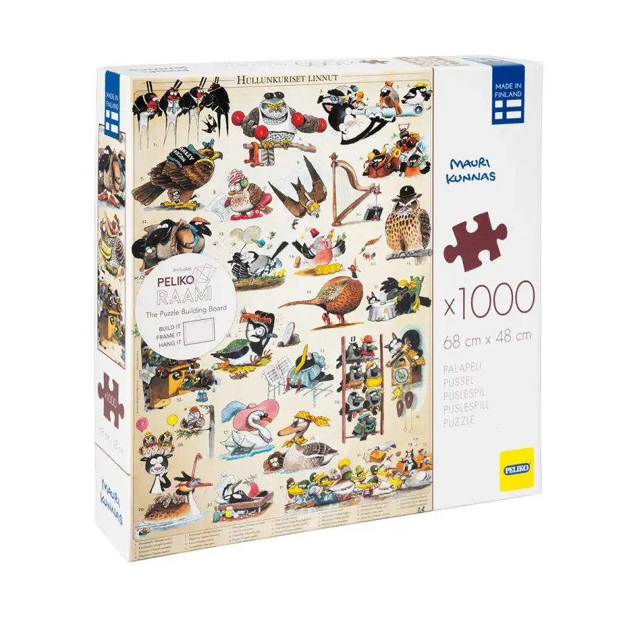 Ett 1000 bitars pussel med ett roligt fågelmotiv av den finska serietecknaren och barnboksförfattaren Mauri Kunnas, i samarbete med Reijo Ikävalko. En domherre som skogshuggare, en kråka med jacka, en svala med hatt och många fler...