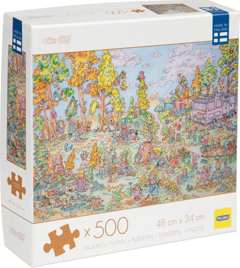 Det är en solig höstdag och folk har tagit sig ut i skogen för att njuta av allt naturen har att erbjuda. Man kampar, grillar över öppen eld, leker i löven, jagar älg och plockar svamp. Ett tecknat pusselmotiv med mängder av roliga detaljer att upptäcka när du lägger bitarna på plats! Motivet är skapat av Oskar Eklöf, illustratör och bildkonstnär från Borgå i Finland.