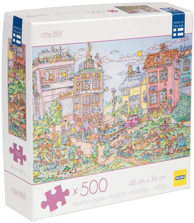 Äntligen har våren kommit! Folk i den lilla staden passar på att njuta av naturen och den efterlängtade grönskan. Man putsar fönster, planterar i pallkragar, sjösätter sina båtar och firar Påsk med äggjakt! Ett tecknat pusselmotiv med mängder av roliga detaljer att upptäcka när du lägger bitarna på plats. Motivet är skapat av Oskar Eklöf, illustratör och bildkonstnär från Borgå i Finland.