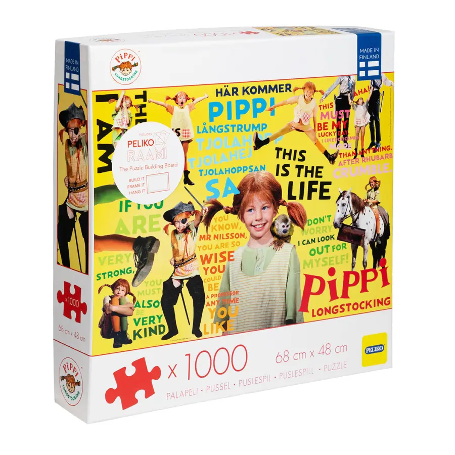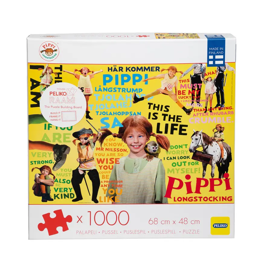Här kommer Pippi Långstrump! Ett 1000 bitars pussel med roliga citat och bilder mot en gul bakgrund. I bilden ser vi Inger Nilsson som spelade Pippi Långstrump i den älskade tv-serien.