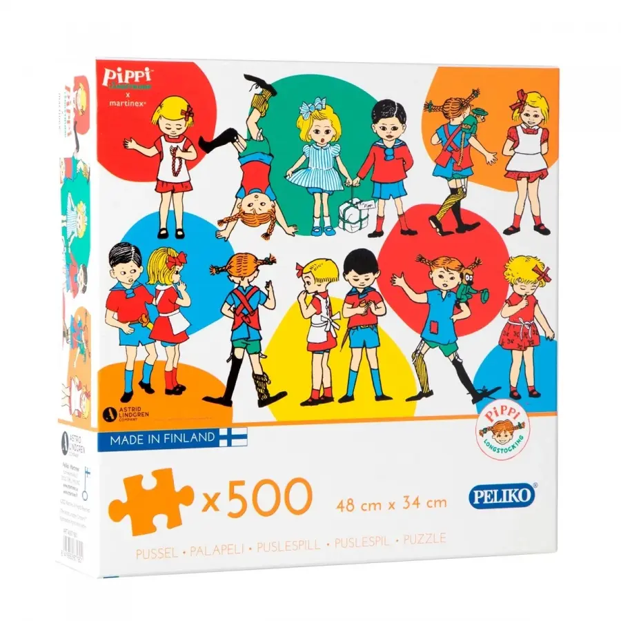 Ett 500-bitarspussel med Pippi Långstrump-motiv. Motivet består av stora runda färgbollar i klassiska Pippi-färger och framför dem står Pippi Långstrump, Tommy och Annika i långa rader.