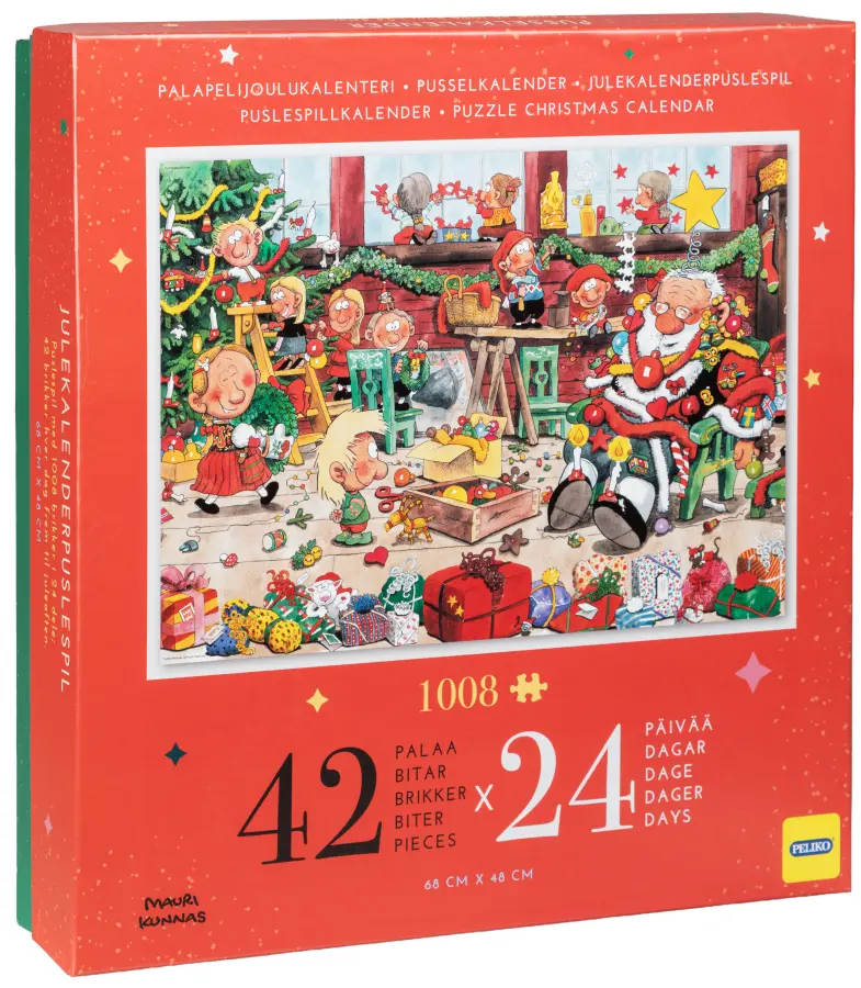 Spännande pusselkalender med 24 luckor att öppna! Varje lucka innehåller 42 pusselbitar och till slut kommer du att ha ett stort färdigt Julmotiv lagom till Julafton.