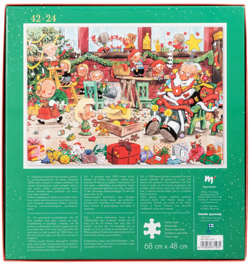 Pusselbitarna är uppdelade i 24 numrerade askar av papp och sorterade i nummerordning i kalendern. Bitarna är även numrerade på baksidan. En lagom stor del av pusslet växer fram varje dag under december. På julafton får man njuta av hela pusslet på 1008 bitar, när de sista bitarna lagts och det fina motivet är komplett!