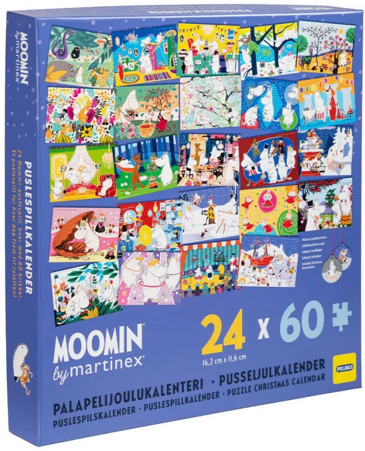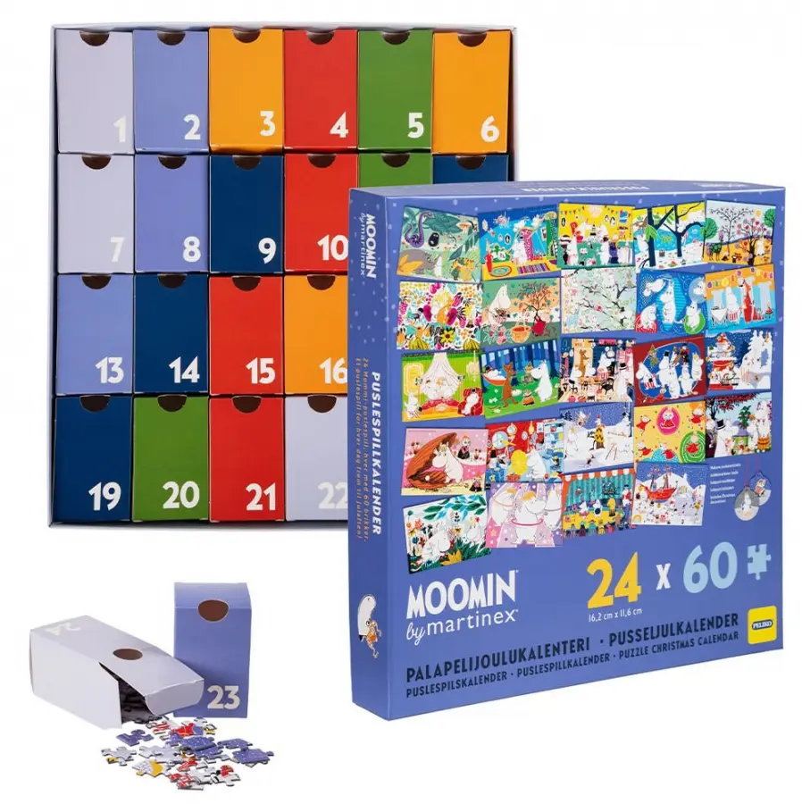 Pusslen har roliga, färgglada och detaljrika motiv av Mumintrollet med familj och vänner. Därtill ingår runda juldekorationer, som tillverkas av kartong som annars hade blivit spill. Denna julkalender gör väntan på Julen mer underhållande, när man får lägga ett nytt pussel varje dag fram till Jul!