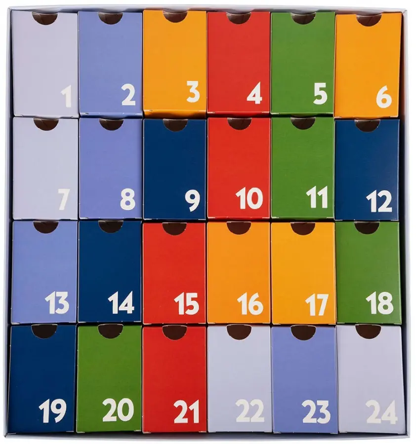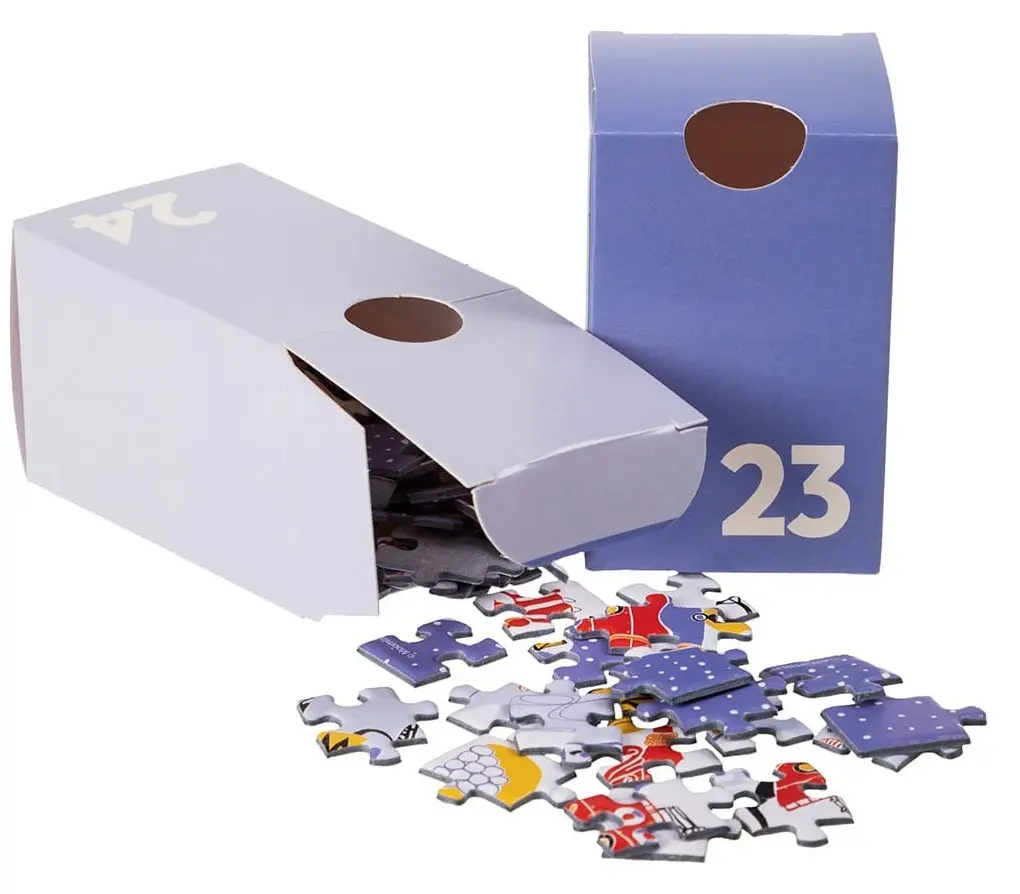 Kalendern innehåller 24 numrerade askar med ett 60 bitars pussel (16,2 x 11,6 cm) i varje ask. Totalt 1440 bitar!