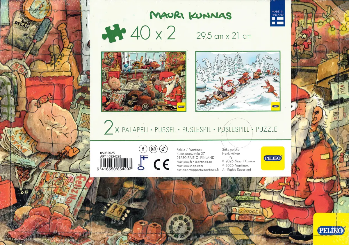 Två rampussel på 40 bitar vardera, med olika Juliga Tomte-motiv fulla av humor. Motiven är skapade av den finska serietecknaren och barnboksförfattaren Mauri Kunnas. Pusslen är i papp med stora pusselbitar.