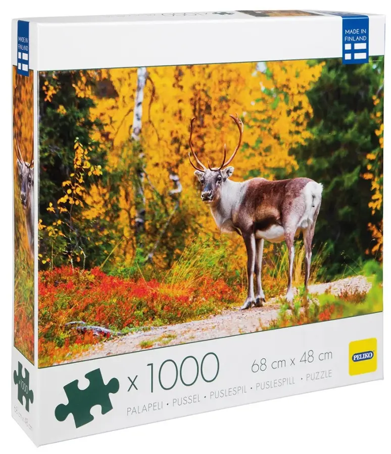En ren står på en skogsstig omgiven av höstens färgprakt.