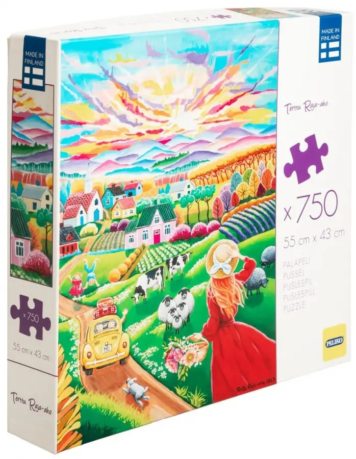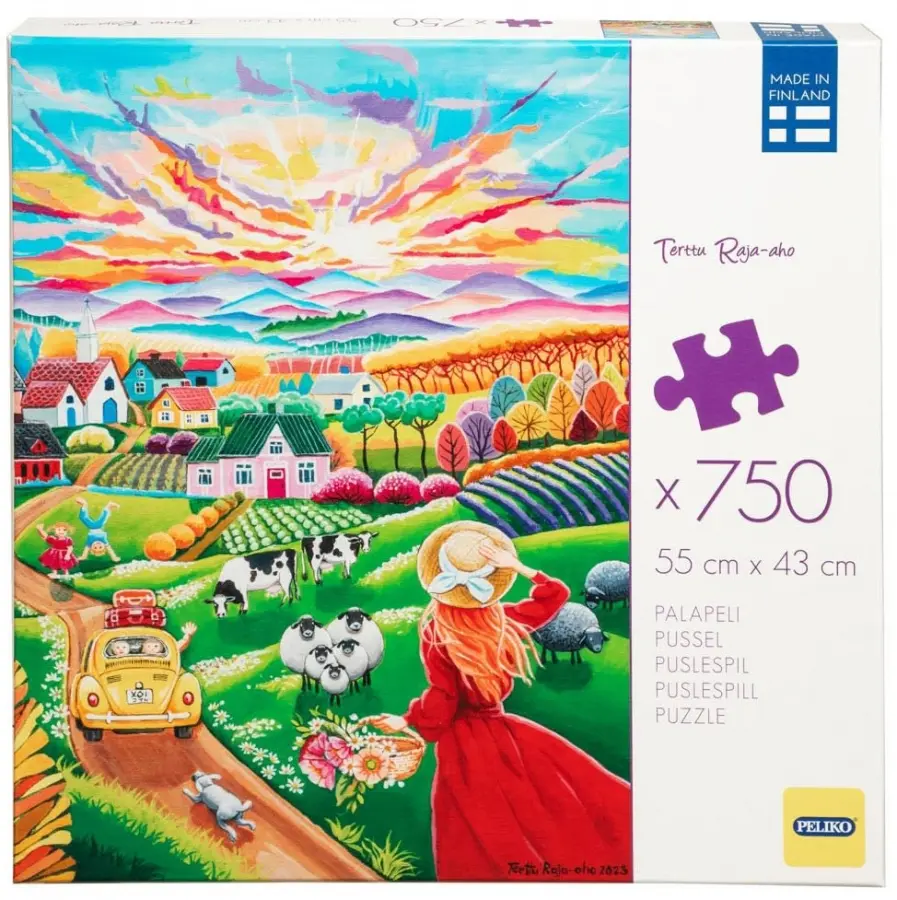Ett 750 bitars pussel från Peliko, med ett färgstarkt motiv av den finska konstnären Terttu Raja-aho. En kvinna i röd klänning blickar ut mot ett sommarlandskap. Här böljar gröna fält med betande får och kor, och i horisonten sprakar solen och lyser ett varmt sken över bergstoppar. Kvinnan vinkas glatt av människor på vägen och i bakgrunden syns en färgglad liten by. Det blir nog en fin hemkomst!