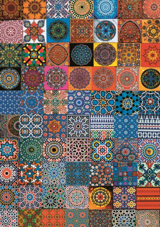 Ett kollage av kylskåpsmagneter i marockanska mönster.