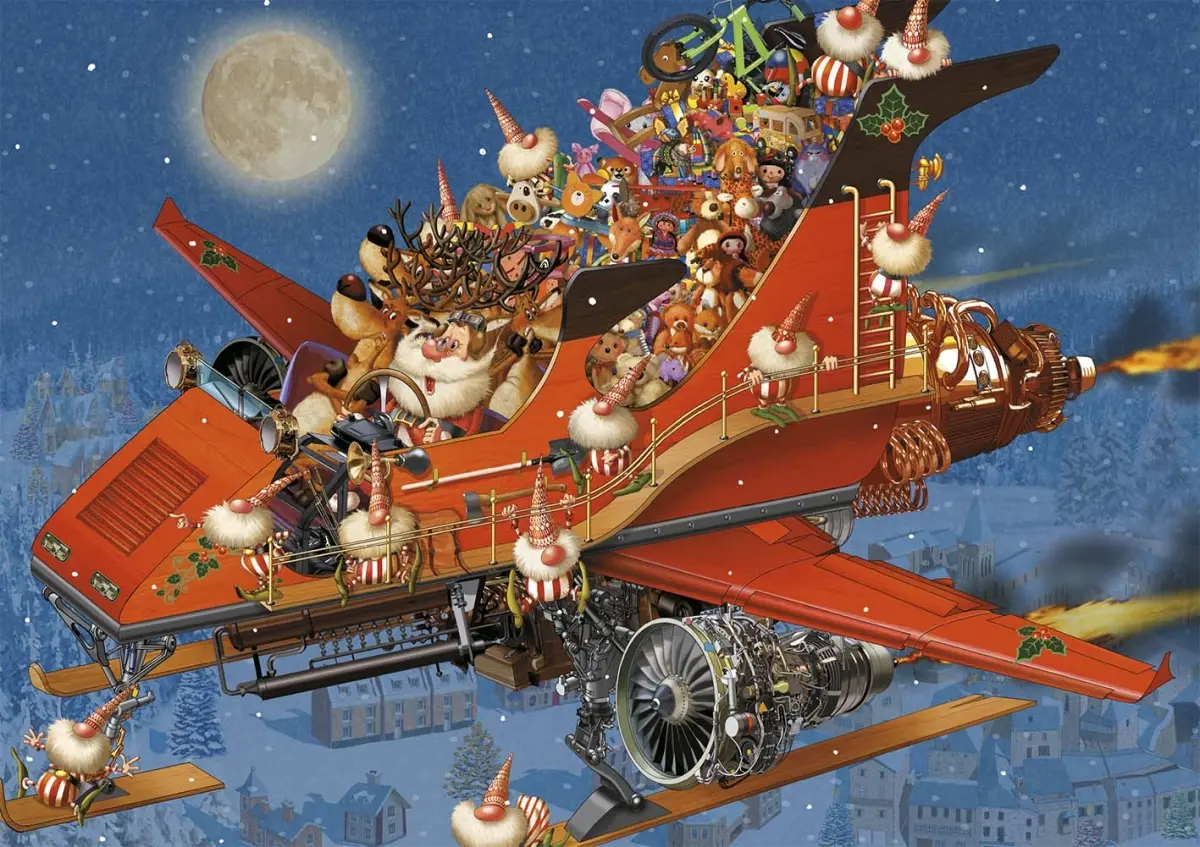 Den här Julen har Tomten uppdaterat sin släde till ett flygplan med jetmotor. Tomten verkar mycket nöjd men renarna, som fått ta plats bredvid honom i förarsätet, verkar inte riktigt lika nöjda. Planet är i alla fall fullastat med leksaker och vi får hoppas att nattens leveranser går smidigt och i raketfart!