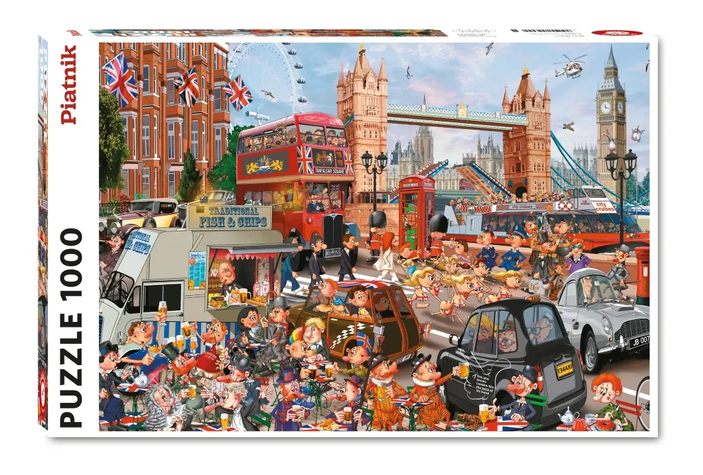 Den humoristiske tecknaren Francois Ruyer tar oss med till London där vi i bakgrunden kan se London Eye och Tower Bridge som klassiska landsmärken. Här finns det massor att upptäcka, någon avnjuter sin afternoon tea, andra väljer en törstsläckande skummande ale i glaset. Men varför jagar egentligen några kvinnor i bikini den där bilen?