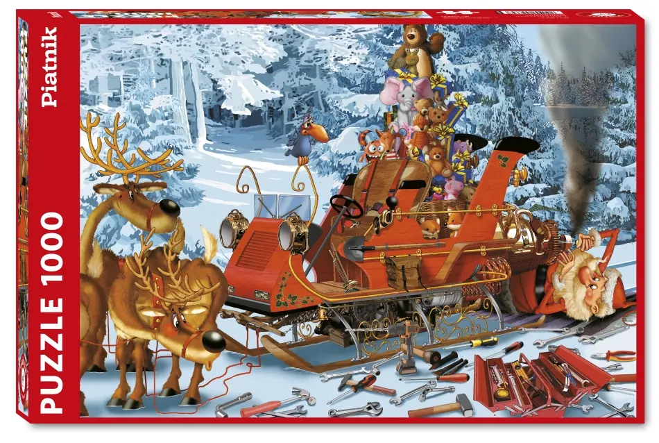 Medan renarna pustar ut har Tomten tagit fram verktygslådan för att reparera den rykande motorn. Leksakerna ligger redo i släden och i bakgrunden syns en snötäckt skog. Kommer klapparna att kunna delas ut i tid?