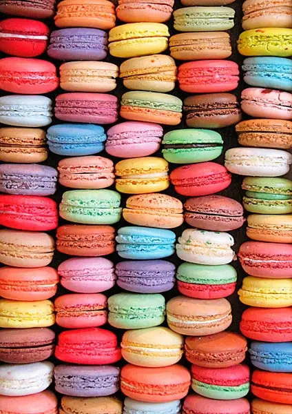 Ett collage av färgglada macarons i härliga färger med olika smaker och fyllningar.