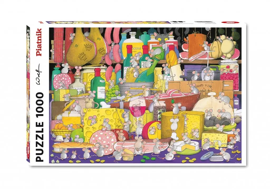 Lyxiga charkuterier, mängder med ostar och goda tillbehör - det är ett riktigt kalas för de glada, söta mössen i detta färgglada och humoristiska pussel.