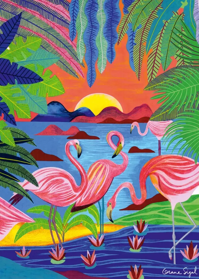 Mot en färgmättad solnedgång ser vi flamingos stå i vattenbrynet. Näckrosor blommar i förgrunden och motivet ramas in av stora blad.