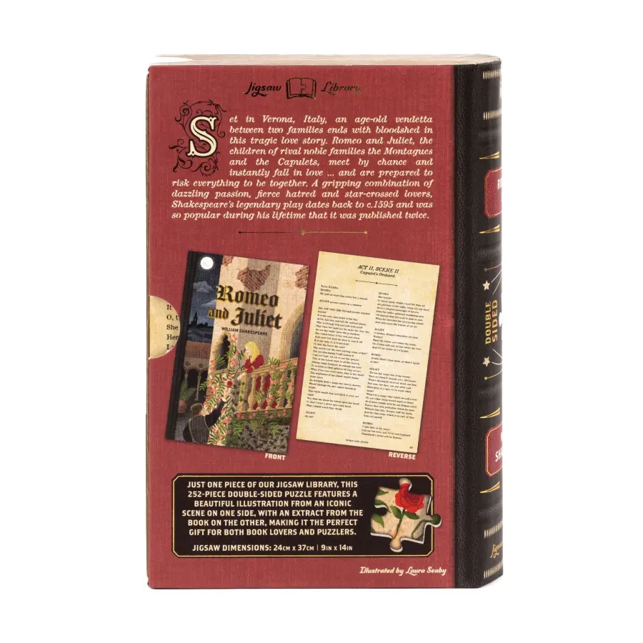 Ett 252-bitars dubbelsidigt pussel, vackert illustrerat, med en av de mest ikonisk scenerna ur William Shakespeares pjäs "Romeo & Julia". På ena sidan av pusslet står Julia på sin balkong, omgiven av rosor och med sin älskade Romeo nedanför. På andra sidan av pusslet finns ett utdrag ur pjäsen och pusslet ligger i en vacker liten ask som liknar en antik bok. En perfekt present till bok- och teaterälskare och pusselentusiaster.