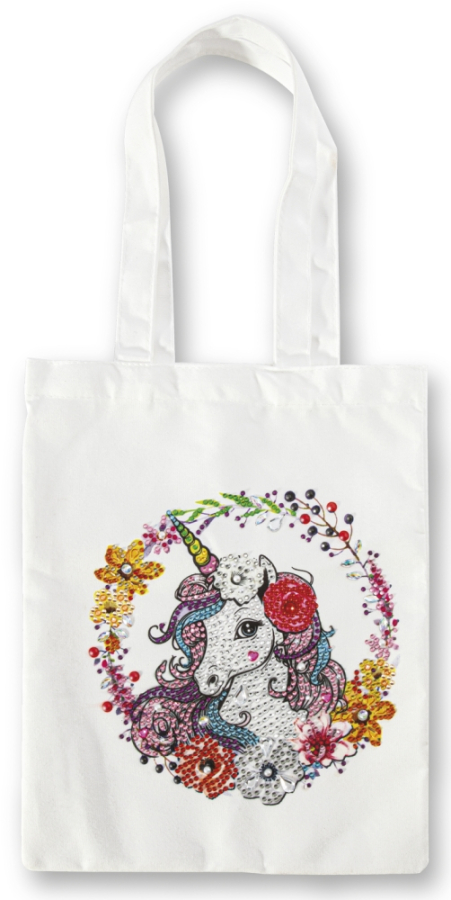 Dekorera din egen enhörnings-tygkasse med diamond painting kristaller! Allt du behöver finns i detta roliga pysselkit.