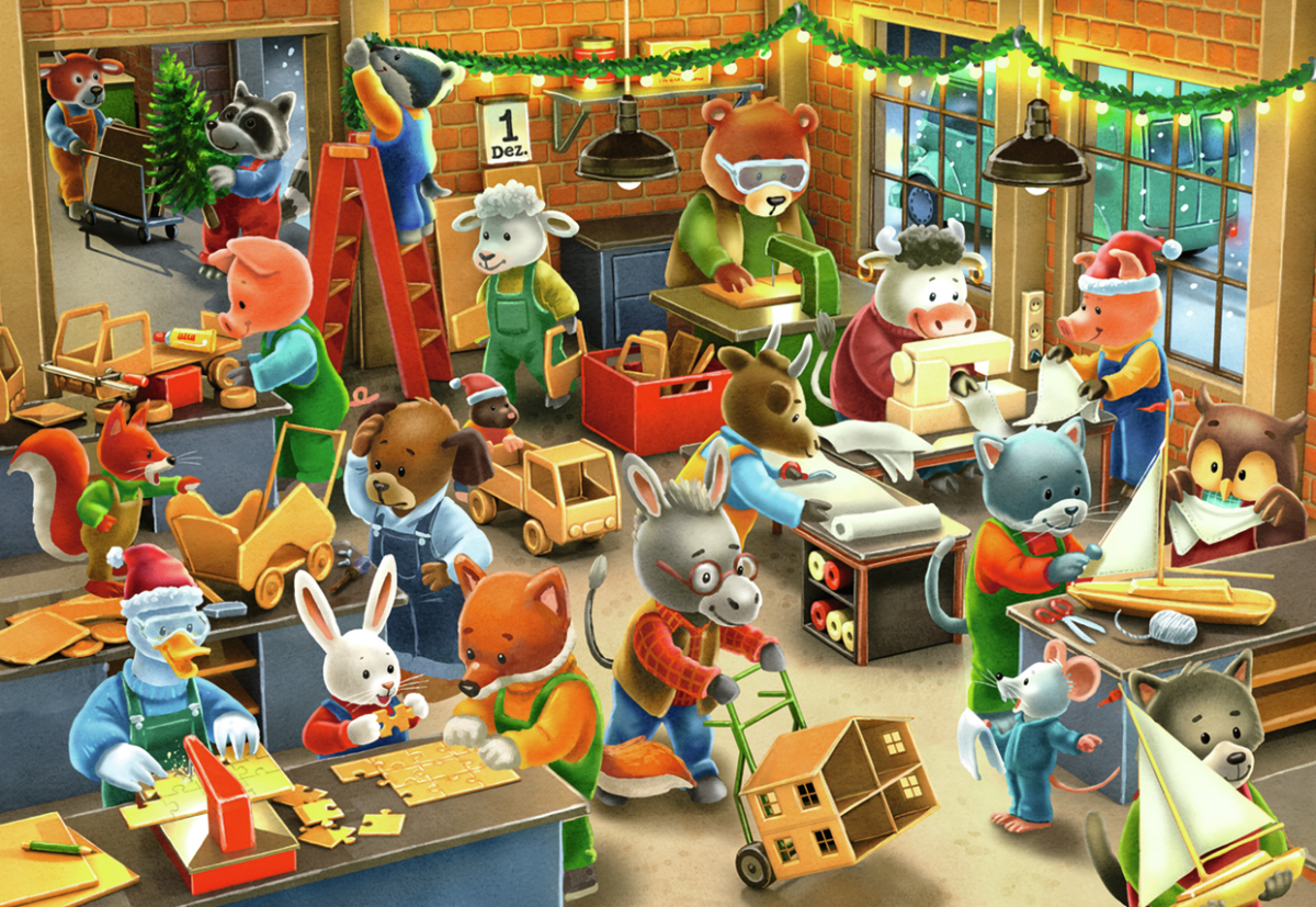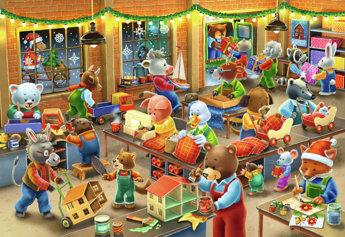 Två pusselmotiv på 12 bitar vardera av en charmig leksaksverkstad i Juletid. I verkstad arbetar djuren med att tillverka leksaker lagom till Jul. Här skapar man dockskåp, bilar, dockvagnar och segelbåtar i trä. En ko syr vita segel till båtarna och en gås, en kanin och en räv hjälps åt att tillverka ett pussel.