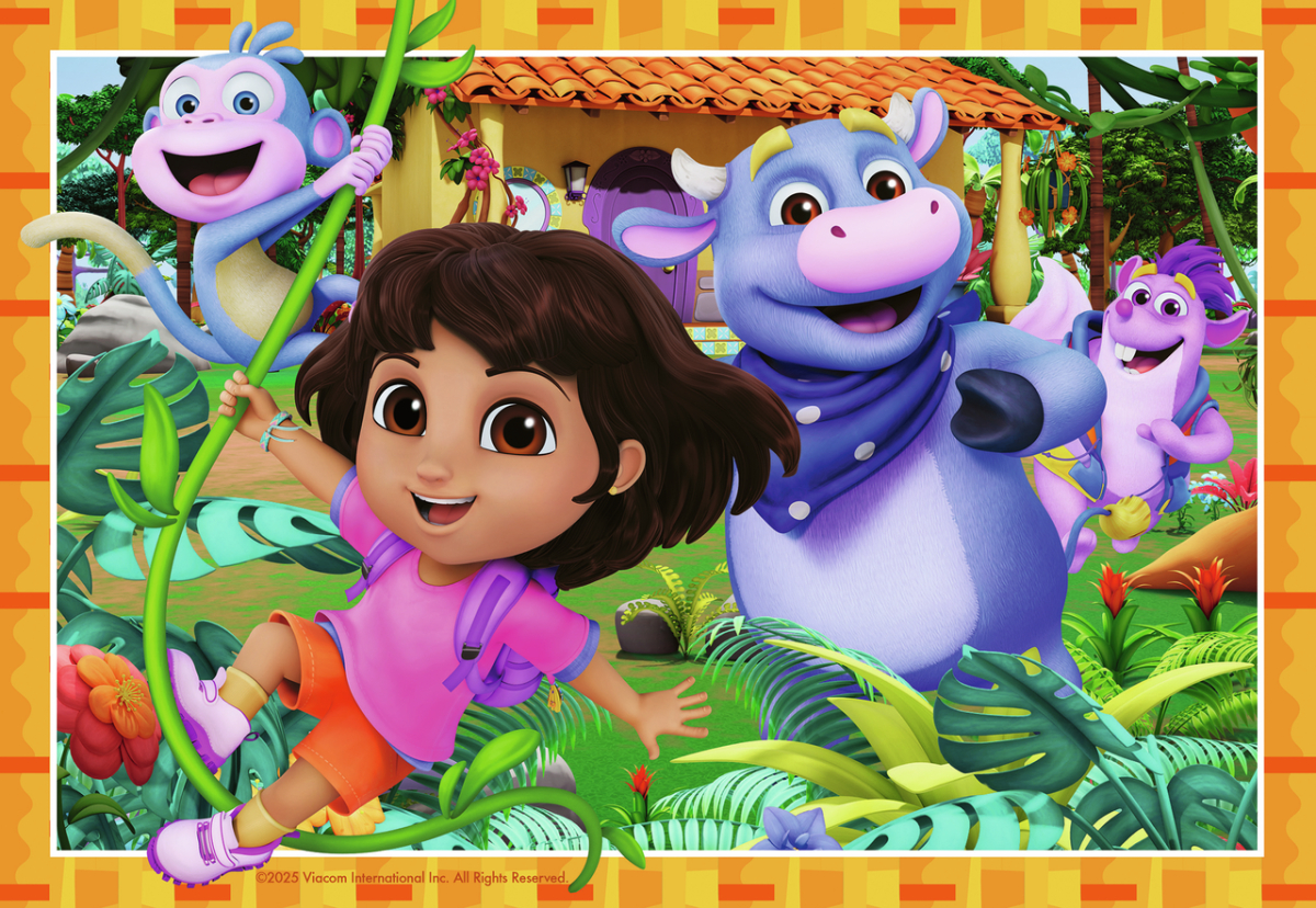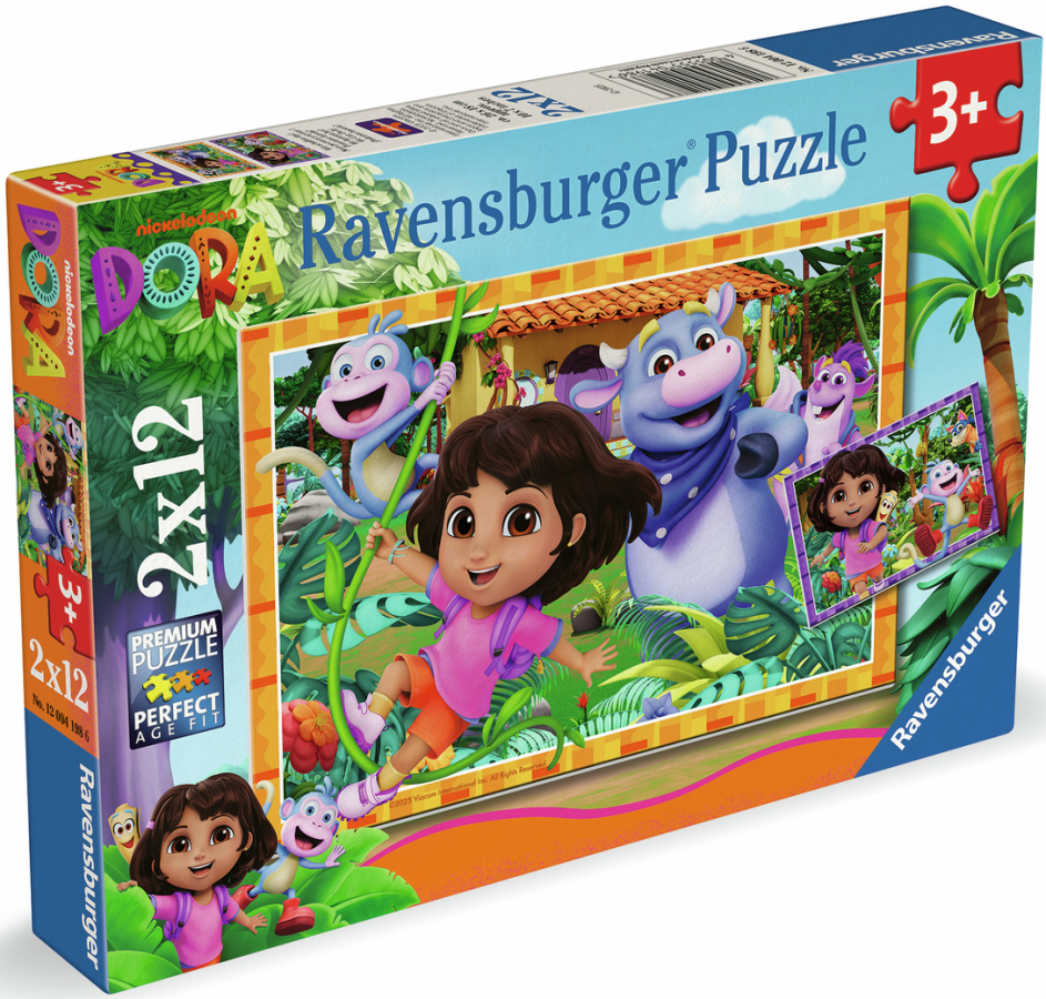 Två pussel på 12 bitar vardera, med olika motiv ur Nickelodeons tecknade serie Dora Utforskaren (Dora the Explorer).
