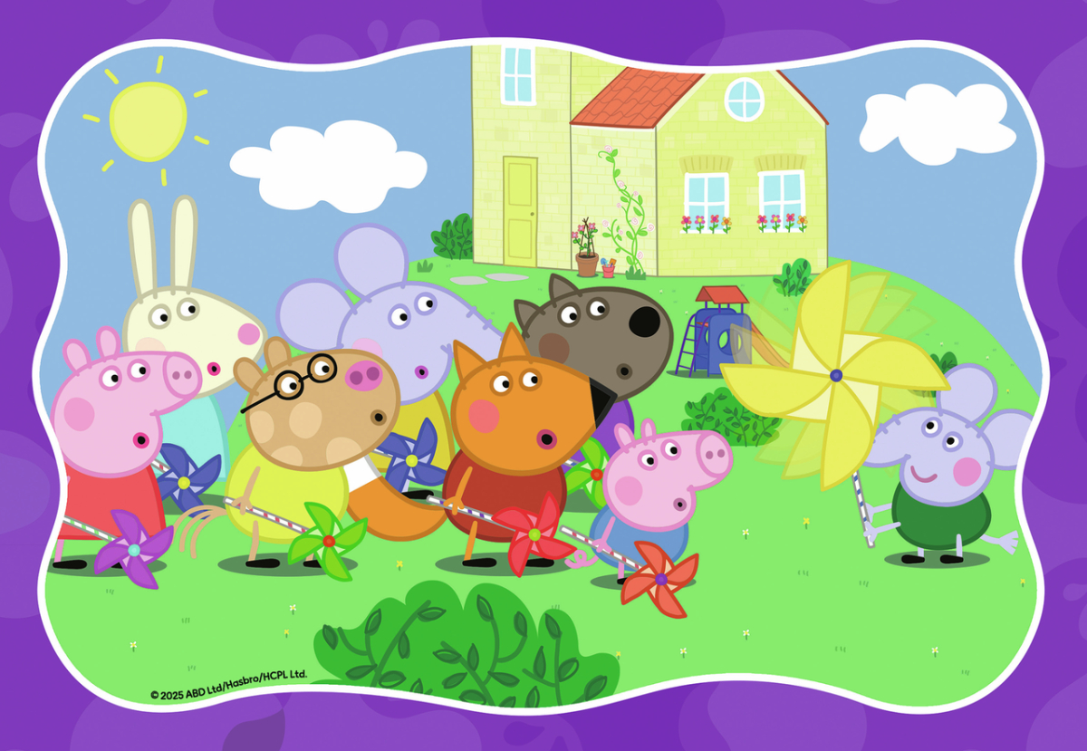 I det ena pusslet ser vi Greta och hennes familj, de är glada och leker med den nya bebisen i vardagsrummet. I det andra motivet är Greta ute i trädgården med sina vänner, de har fått vindsnurror och fascinera av hur de snurrar i vinden.