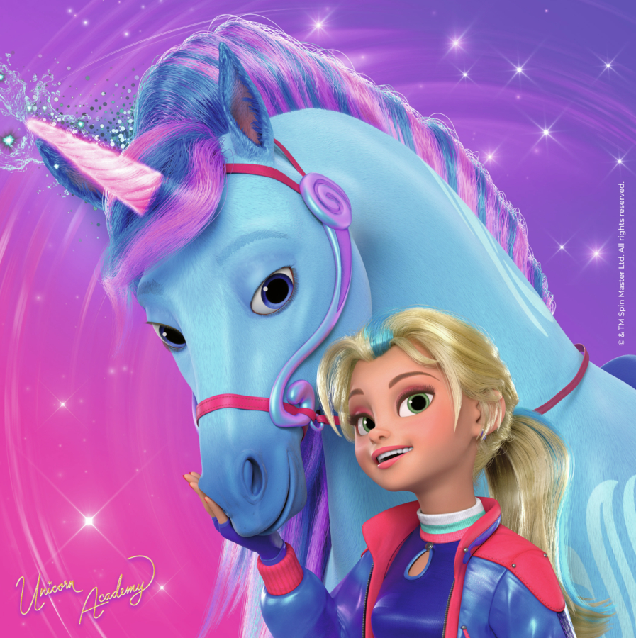 Tre skimrande pusselmotiv ur Netflix serien Unicorn Academy, på 49 bitar vardera.