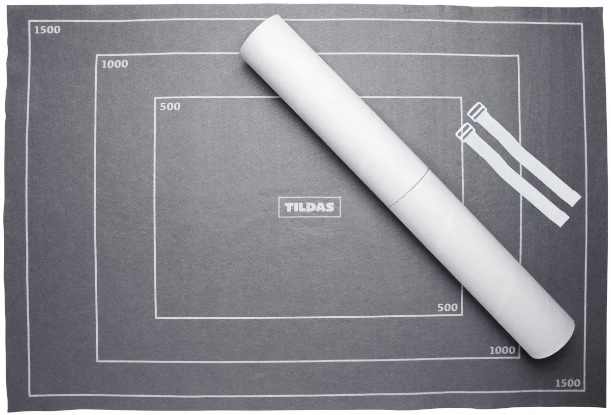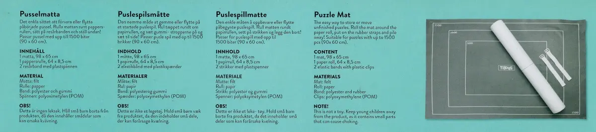Innehåller pusselmatta med storleksmarkeringar, tvådelat rör i hård papp samt två spännband.