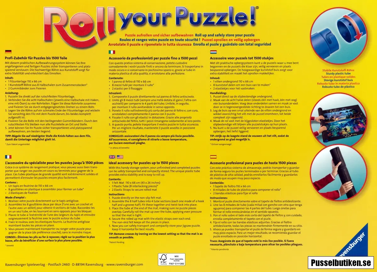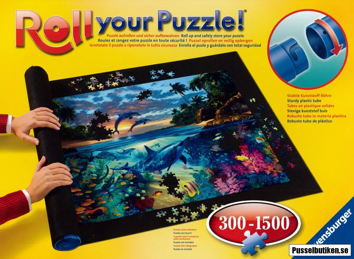 När du vill lägga undan pusslet rullar du bara upp mattan med pusslet på rullen. Nästa gång det ska pusslas rullar du ut mattan på bordet igen.