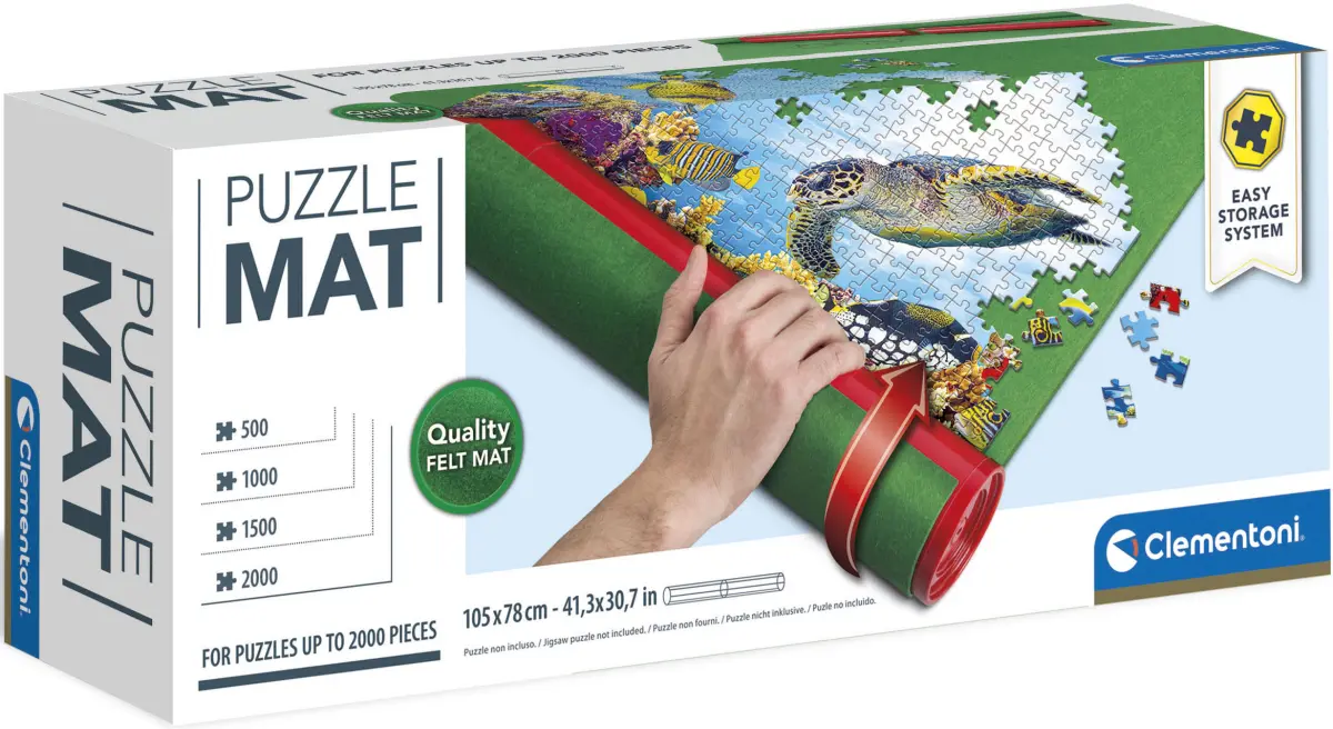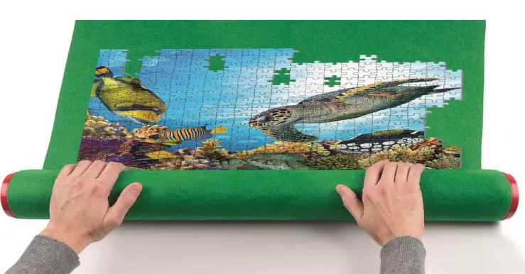 Pussla direkt på pusselmattan. När du vill lägga undan ditt pussel placerar du det medföljande plaströret i änden av mattan, och rullar ihop mattan med pusslet på. Efteråt kan du säkrar med de medföljande spännbanden. När du är redo för nästa pusselstund är det bara att rulla ut din pusselmatta igen. Mattan är gjord i filt så att bitarna fastnar lite på filtytan och inte glider av.