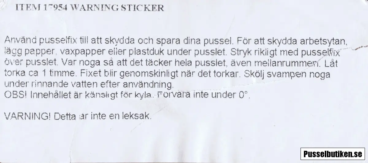 Enligt tillverkaren räcker detta till 4000 bitar. Limmas på pusslets motivsida. Innehåller en svamp i toppen av flaskan.