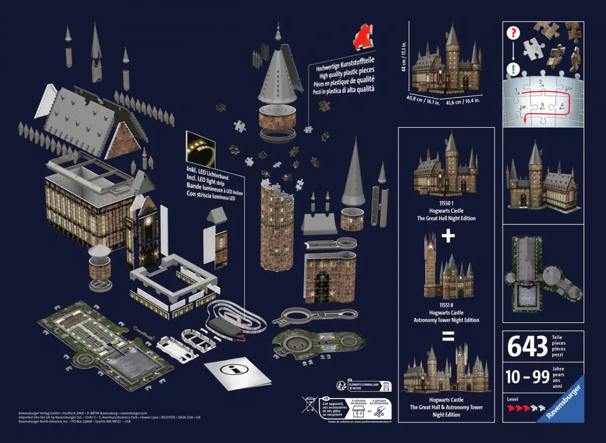 Tack vare den geniala EasyClick-tekniken kan pusselbitarna sättas ihop utan någon magi för att bilda en dimensionellt stabil byggnad. Illustrerade instruktioner och numrerade pusselbitar hjälper till att skapa ett extremt realistiskt Hogwarts i miniatyr med belysning. Helt enkelt magiskt!