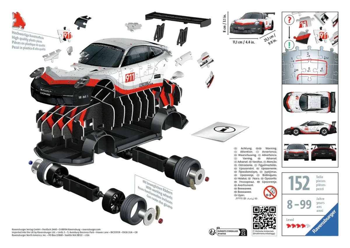 Den ikoniska Porsche 911 GT3 Cup som 3D-pusselmodell med realistisk design och färger i vitt och rött!