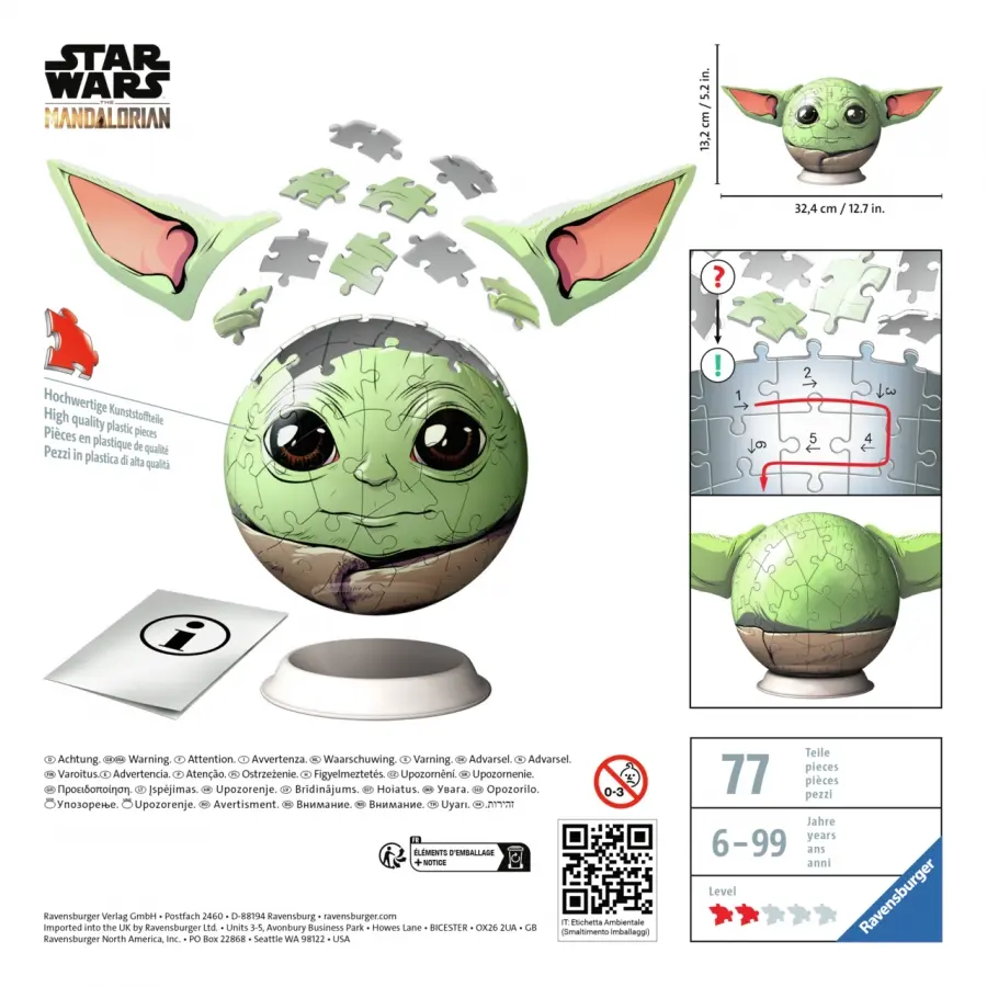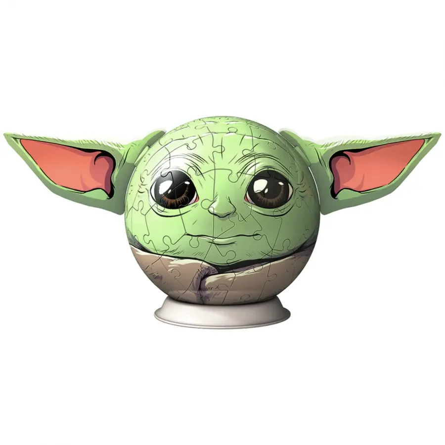 Det färdiga pusslet blir en pusselboll av Grogus ansikte och två stora öron i papp följer med som går att fästa på huvudet för att färdigställa din egen Grogu-modell. Ett litet ställ ingår också, den perfekta presenten för alla Star Wars The Mandalorian fans!