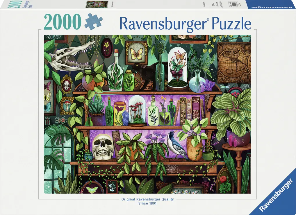 En häxas favoritsaker står fint uppställda på hyllor av trä. Här finns döskallar, växter, djur, viktiga böcker och magiska kristaller. Ett fantasymotiv fullt av gröna växter och färggranna detaljer för dig som vill ha en lite större pusselutmaning på 2000 bitar!