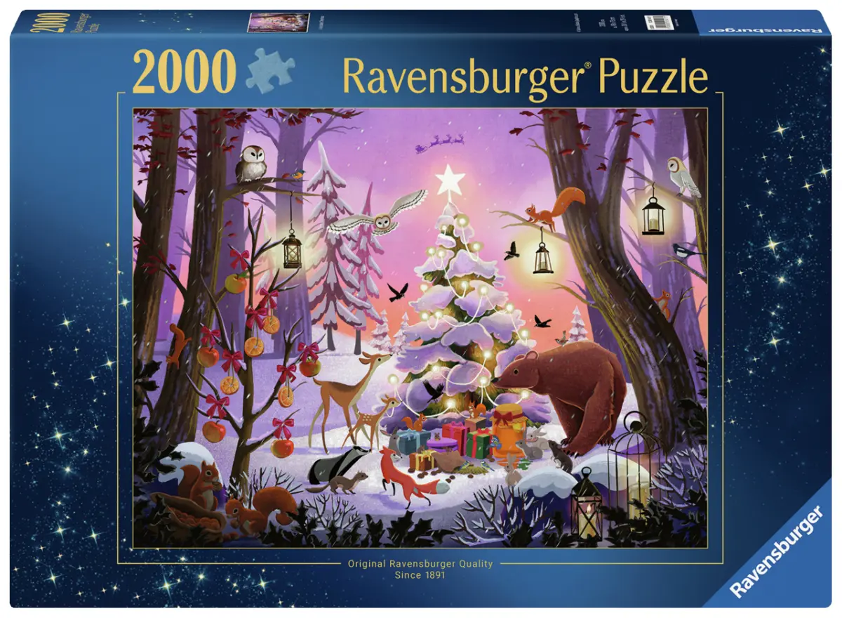 Det är Jul i skogen, snön faller sakta och djuren har dekorerat fint med Julgran, ett träd med äpplen och apelsiner och fina lyktor. Man ser tomten fara mot den lilaskimrande himlen och jag tror att det snart är dags att äntligen få öppna julklapparna!