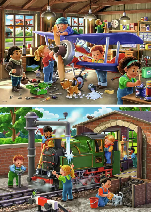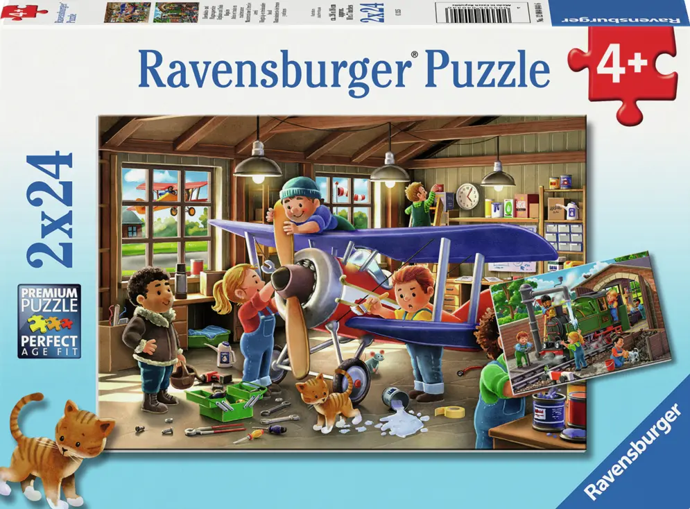 Två pussel på 24 bitar vardera, med olika motiv där man reparerar fordon.