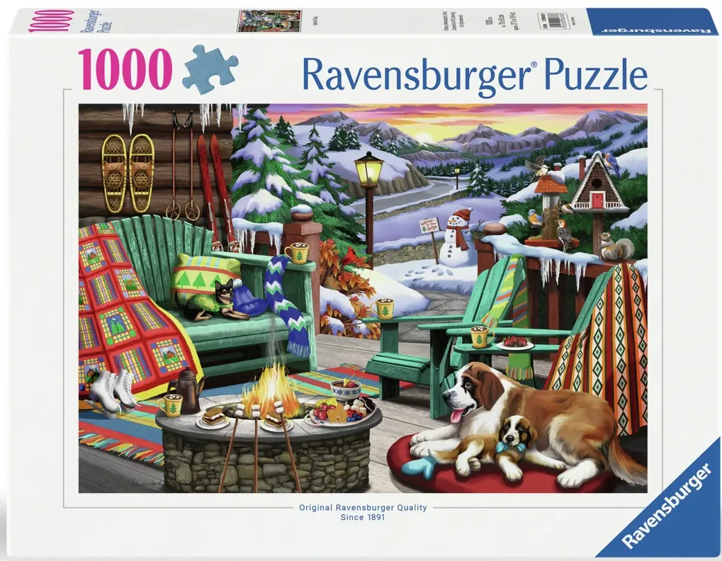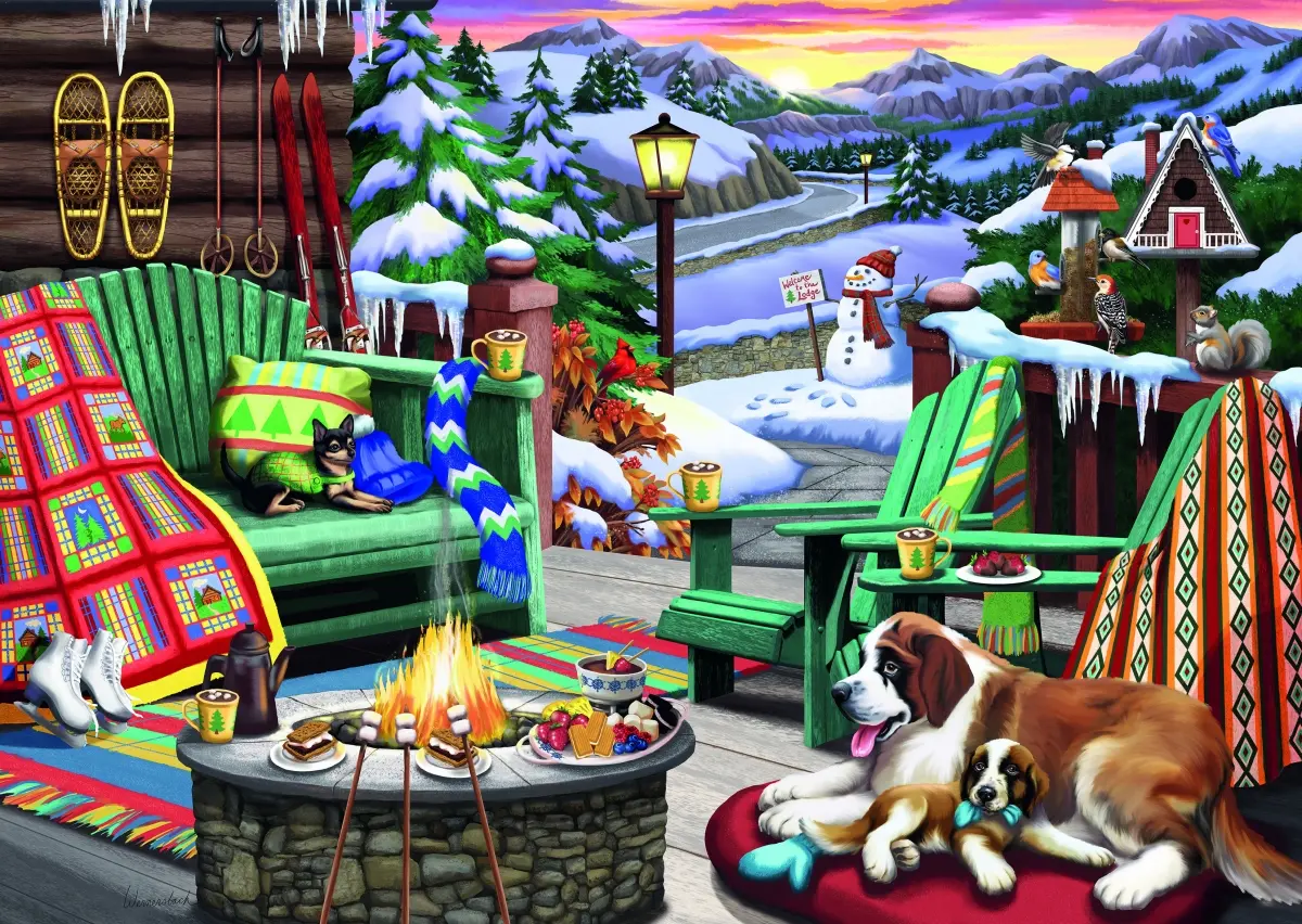 På en veranda i de snöbeklädda alperna finns en mysig sittgrupp vid en eldstad. Efter en härlig vinterdag på skidor och skridskor är det mysigt att få sätta sig ner vid elden och dricka varm choklad och grilla marshmallows. Fåglarna och ekorrarna passar också på att ta mellis vid fågelbordet och en sanktbernhardshund vilar sig tillsammans med sin lilla valp.