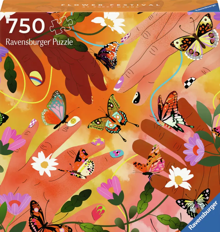 Fyra händer möts bland blommor och fjärilar. I bakgrunden syns varma mjuka färger i gult, orange och rosa. Motivet är skapat av illustratören Poppy Magda.