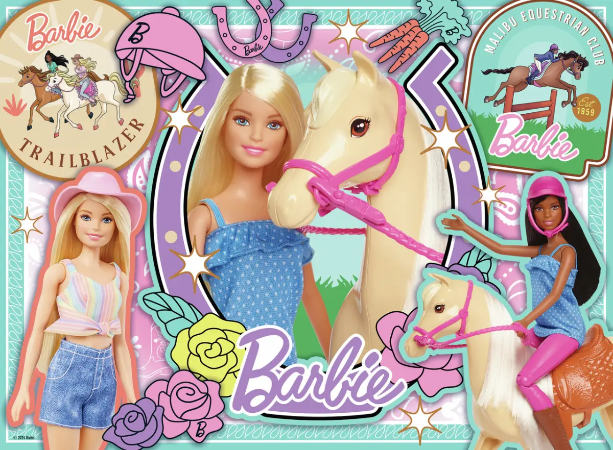 Ett kollage av bilder där Barbie och hennes vänner är ute på ridtur. Ett perfekt pusselmotiv för alla Barbie- och hästfantaster!