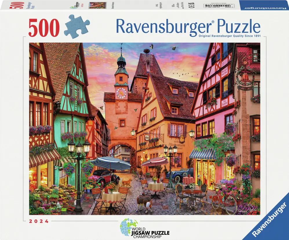 En pittoresk stadsvy någonstans i det Tyska Bayern. Här står korsvirkeshus i glada färger tätt ihop längs kullerstensgatan, och butikernas skyltfönster lyser i ett inbjudande varmt sken. Solen håller på att gå ner och skänker ett rosa sken över klocktorn och taknockar. Gatlyktorna har tänts och restauranger och blomsterbutiker är öppna för stundande kunder. Några hundar är på upptäcktsfärd i den lilla byn och fina veteranbilar står parkerade lite här och var.