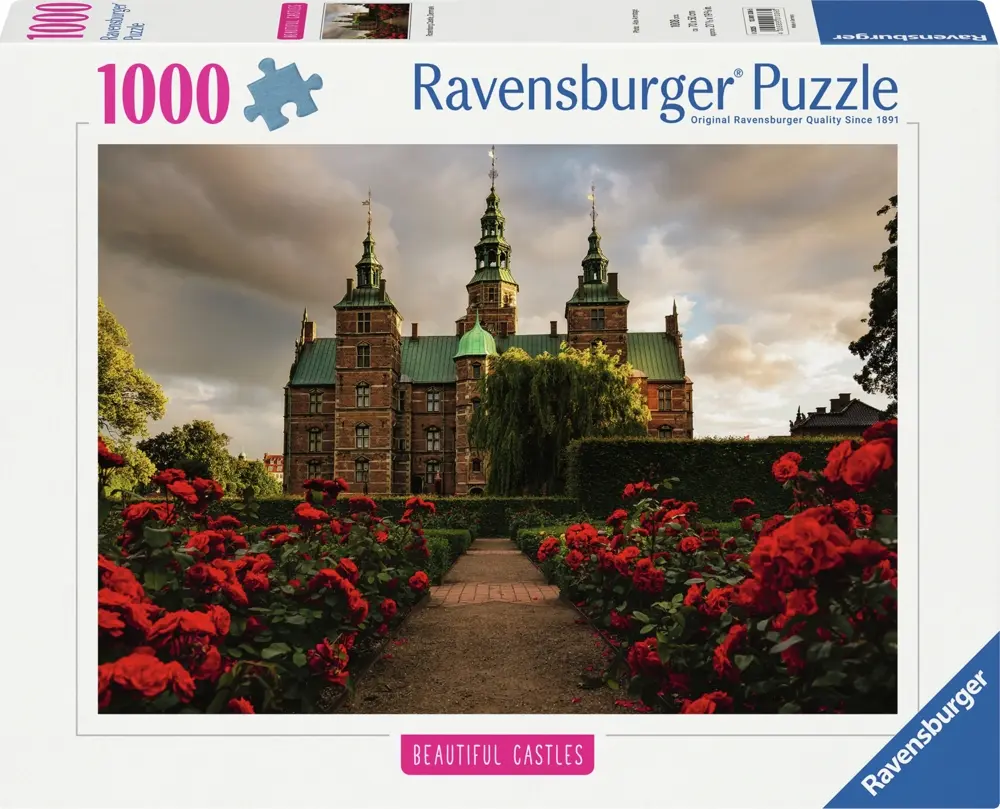 Motiv av Rosenborgs slott med vackra röda rosor i förgrunden och en himmel där solens strålar silas igenom mörka moln på himlen.