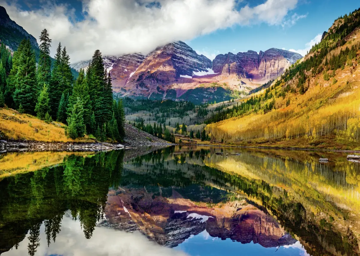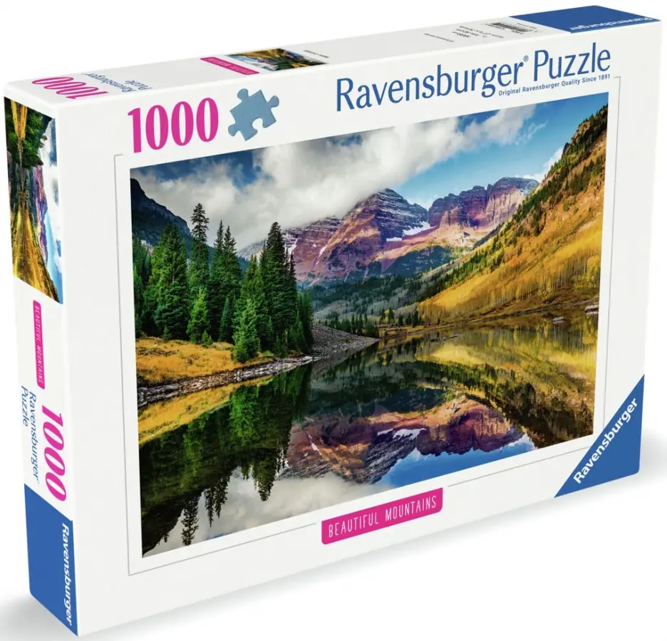 I detta motiv kan vi se bergstoppar i en rosa ton som sträcker sig mot en blå himmel. Vid bergets fot syns skogen med bladträd som fått gulnade blad och gröna granar. Berget och skogen speglar sig i en blank sjö i förgrunden.