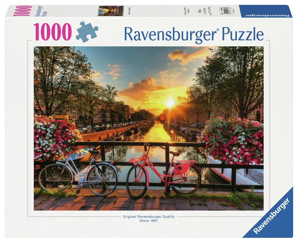 Ett klassiskt motiv från Amsterdam med stadens mest kända signum! På en av stadens broar står två cyklar parkerade med praktfulla blomsterarrangemang på vardera sida. Längs med den lugna kanalen ligger husbåtar förtöjda och alléer och husfasader är vackert belysta av en varm solnedgång.